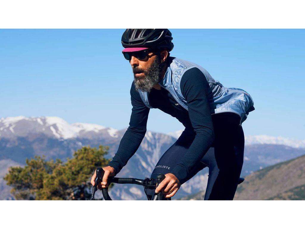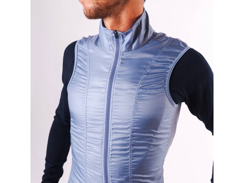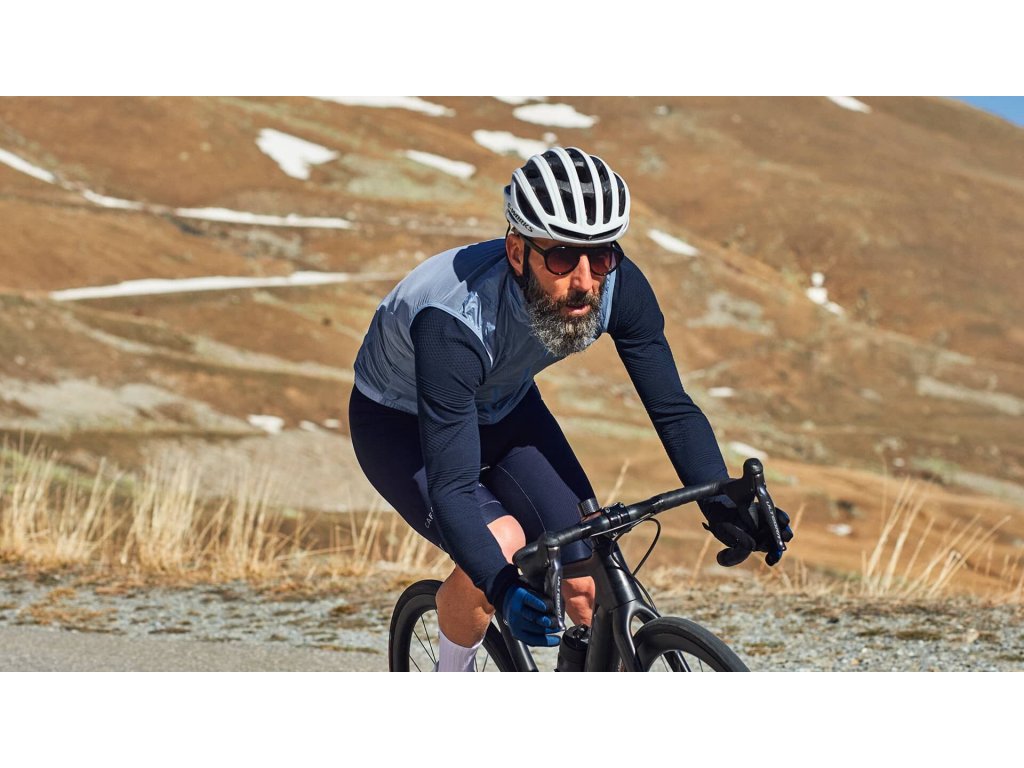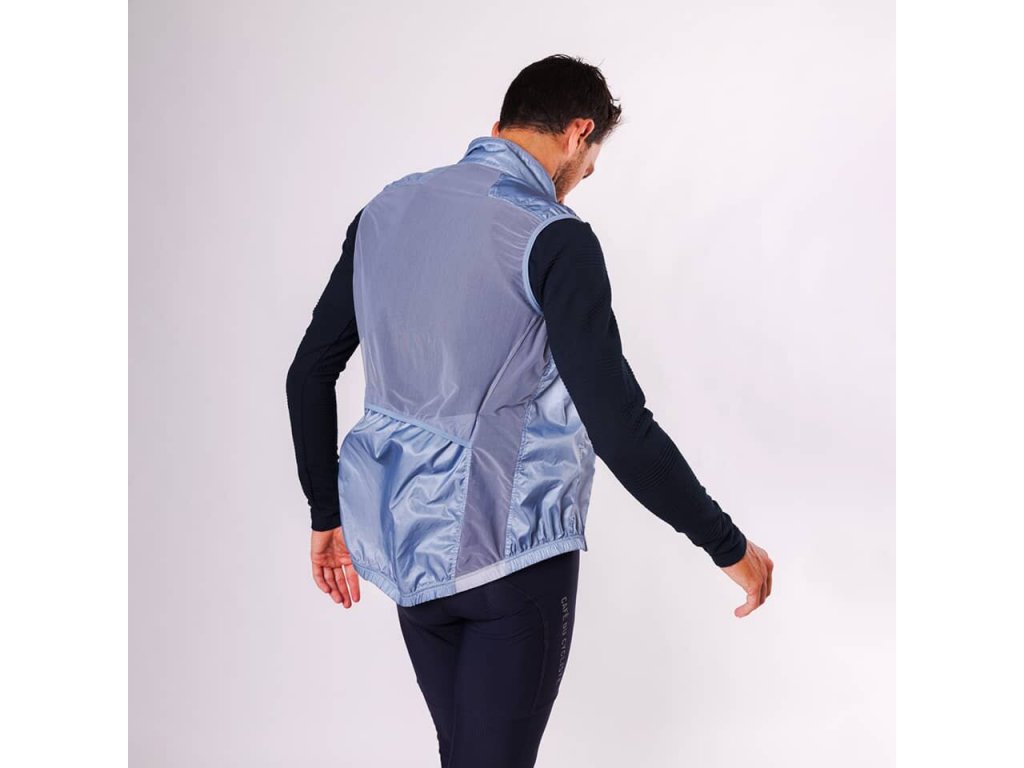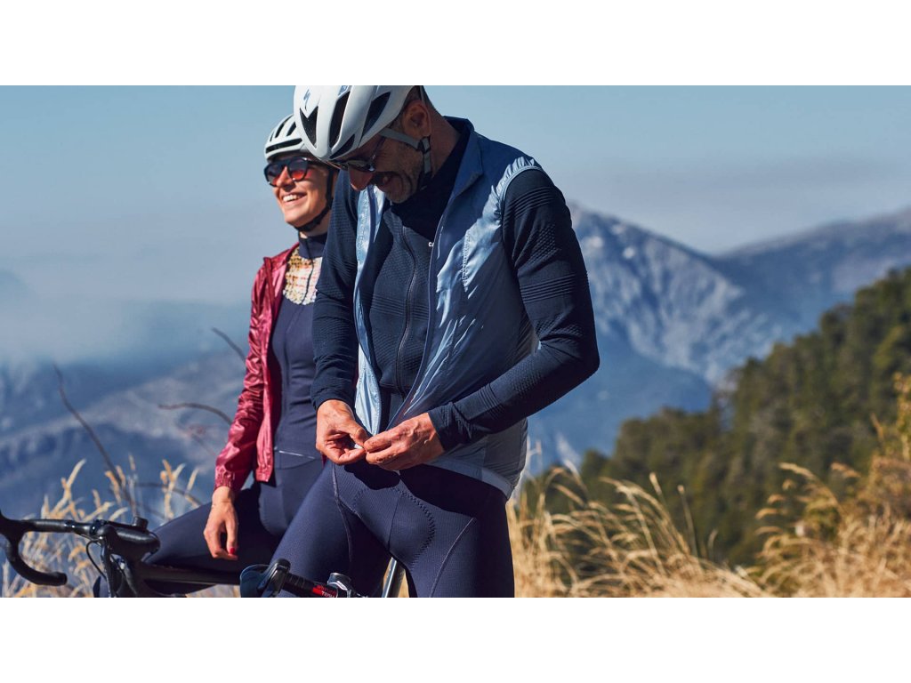 Cyklistická vesta závodního střihu má plný zip, elastický pas pro větší stabilitu a otvor pro snadný přístup k kapsám v dresu.