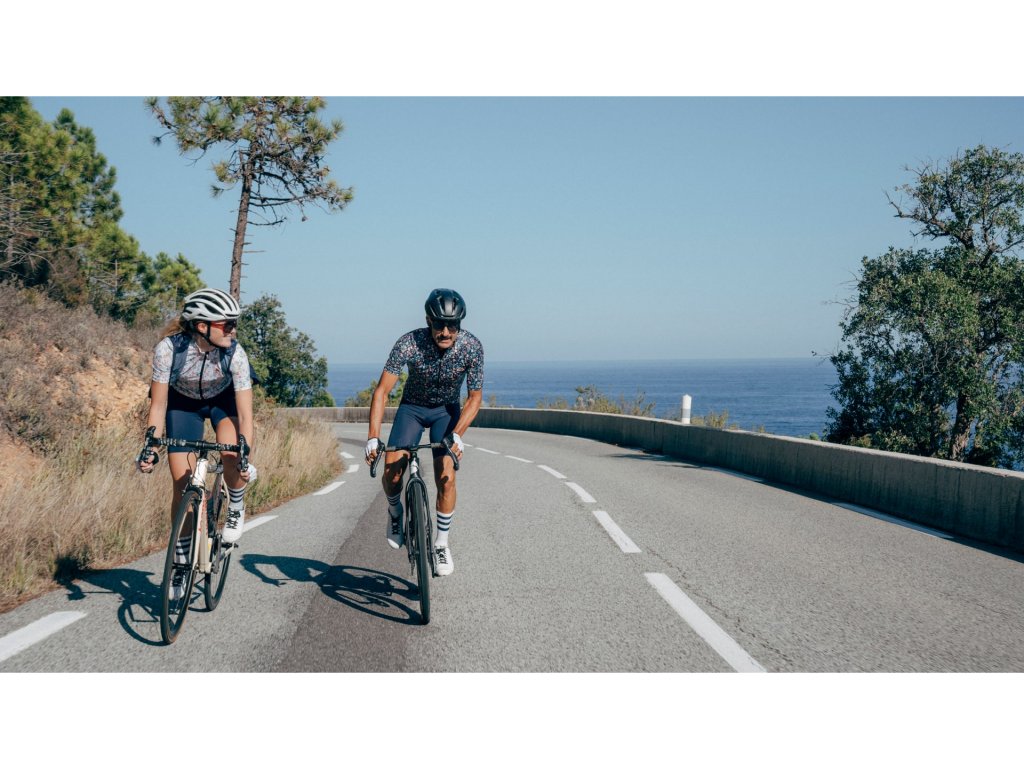 Silniční cyklistické oblečení, které se táhne přes technické dresy, prémiové laclové kraťasy, ochranné vrstvy a celou řadu doplňků. Vše obsesivně navrženo na Azurovém pobřeží.