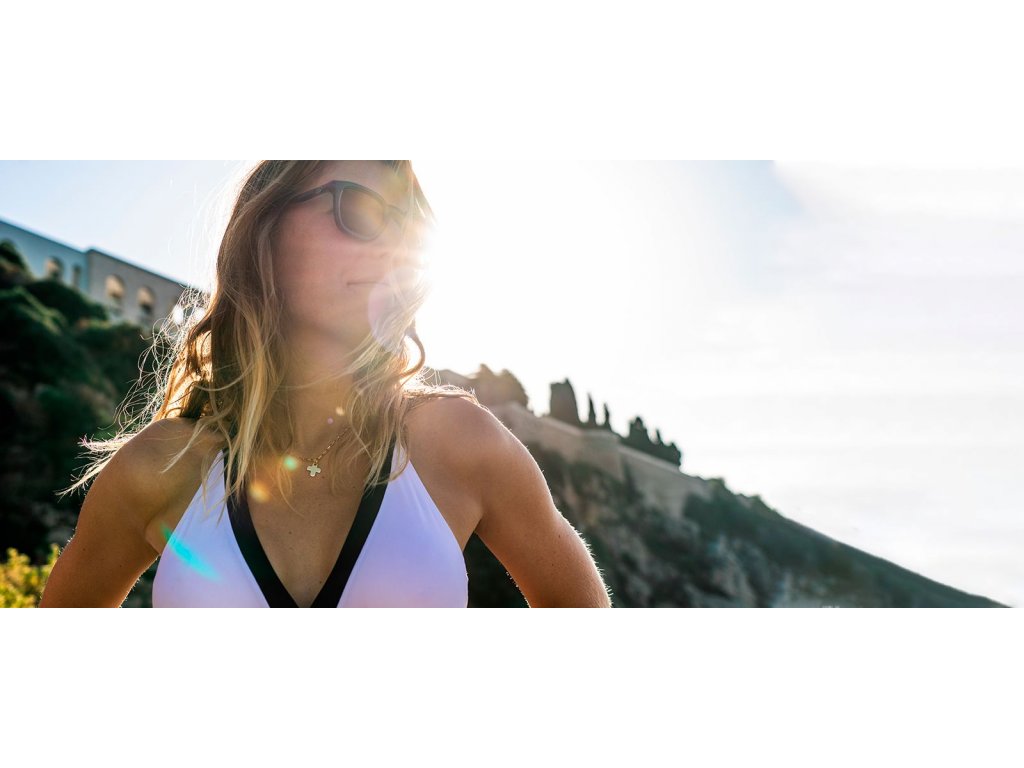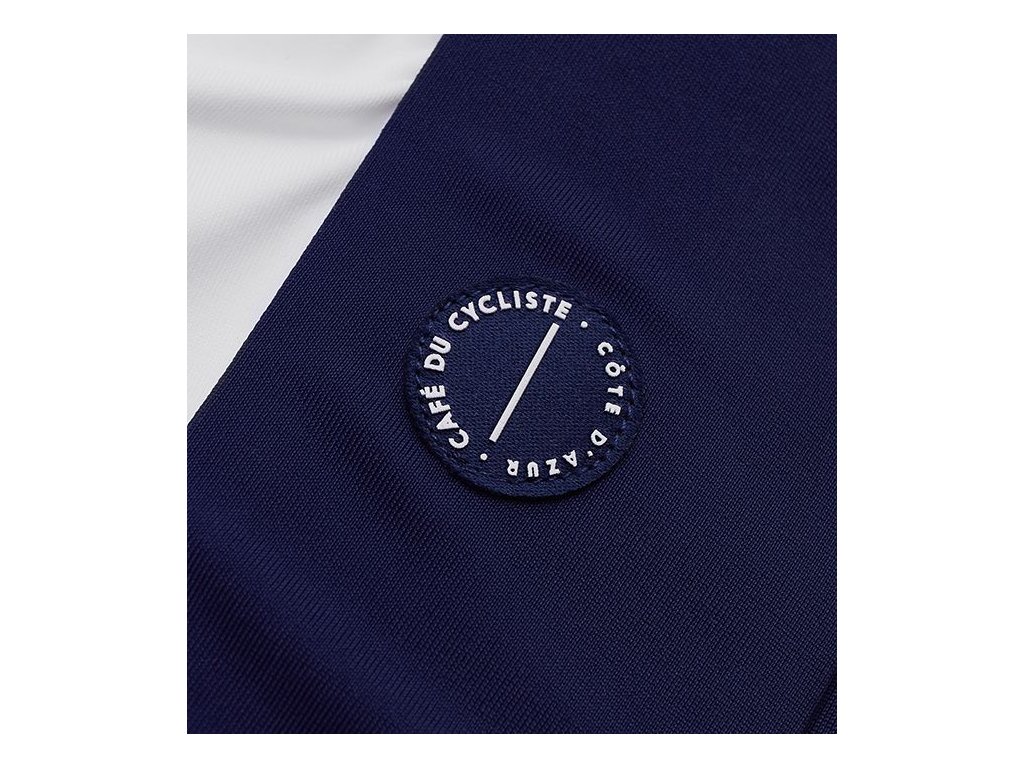 S výrazným zbarvením Cote d'Azur a ochranným faktorem 50 má kostým na krku zapínací kravatu a na pasu kulatý odznak Café du Cycliste. Dokonale vyvážený pro život mezi okolím města a pláží.